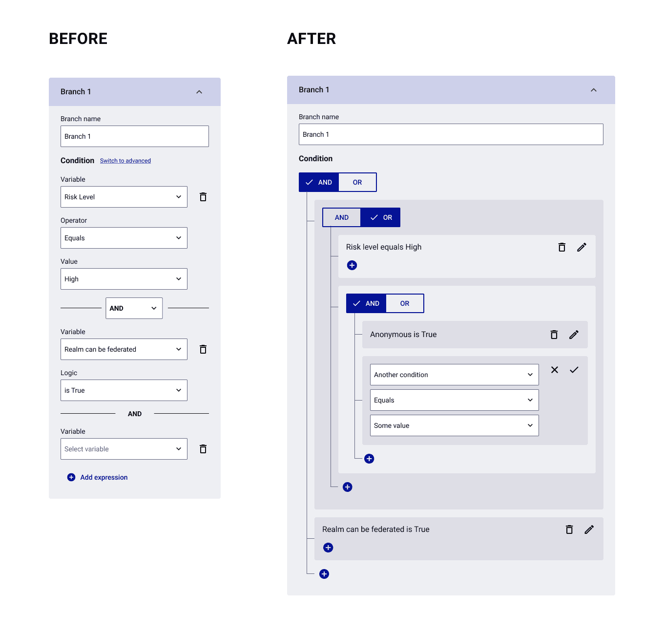 These mockups shows the new interactions introduced in Phase 2, such as the ability to add and edit conditional branches with multiple levels of AND/OR logic.