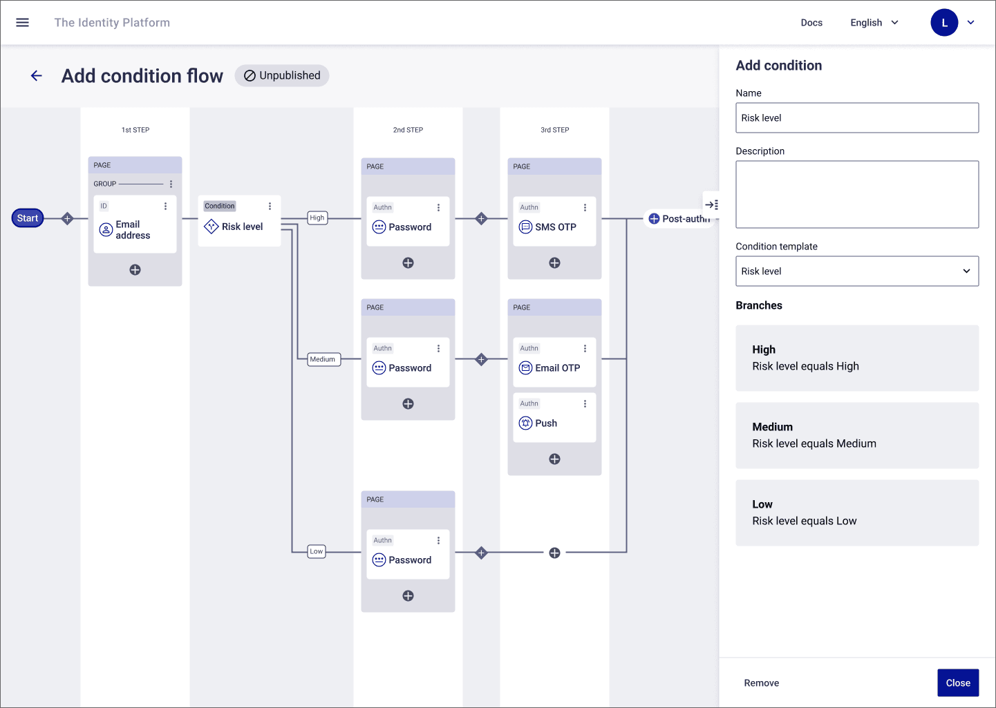 The authentication journey builder is a core capability on the identity platform. This lets the user set up their desired login flows in a structured swimlane-style layout.