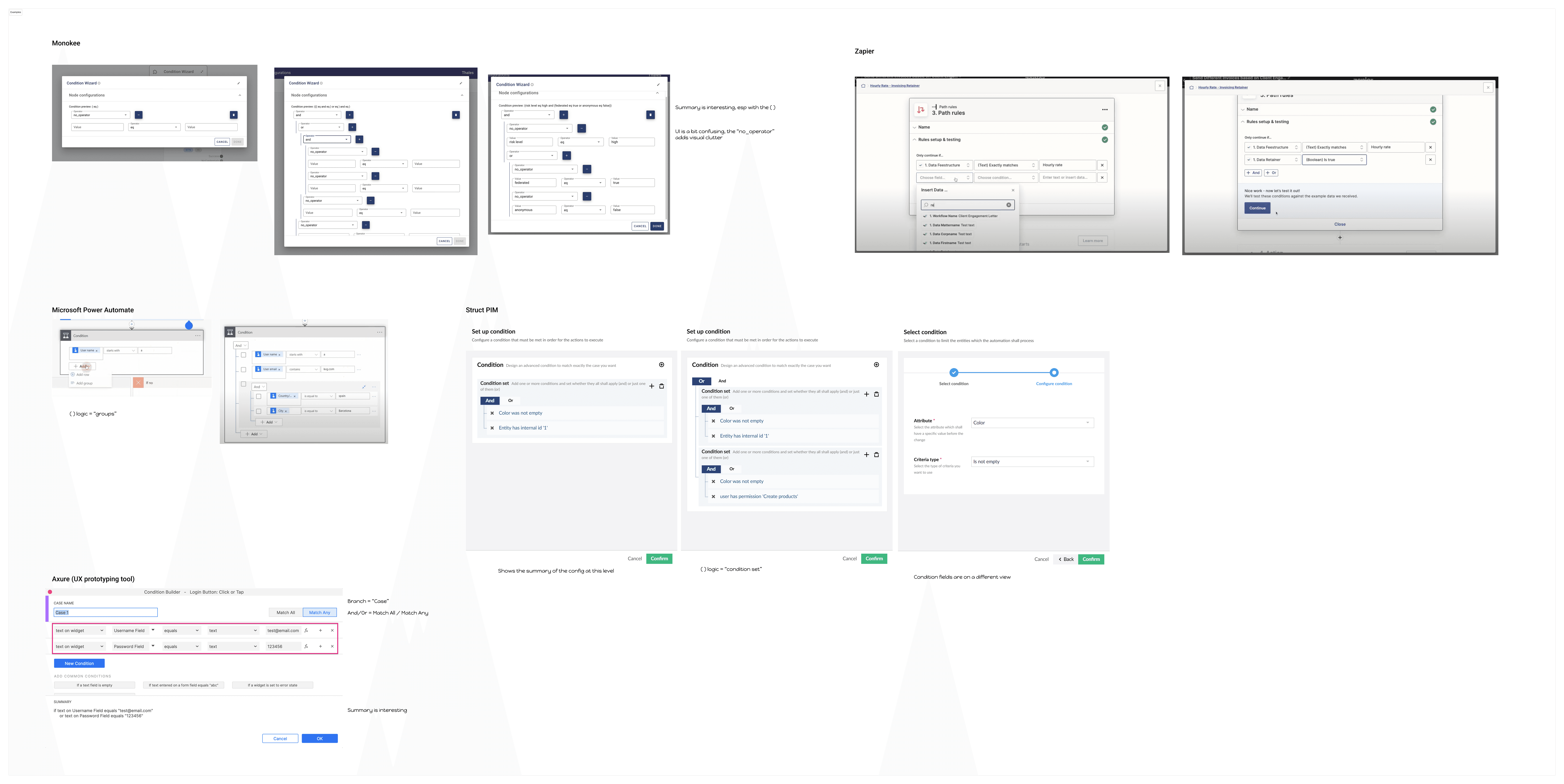 Examples from other platforms showing a tree-style UI anchored to the logical AND/OR operator at top.